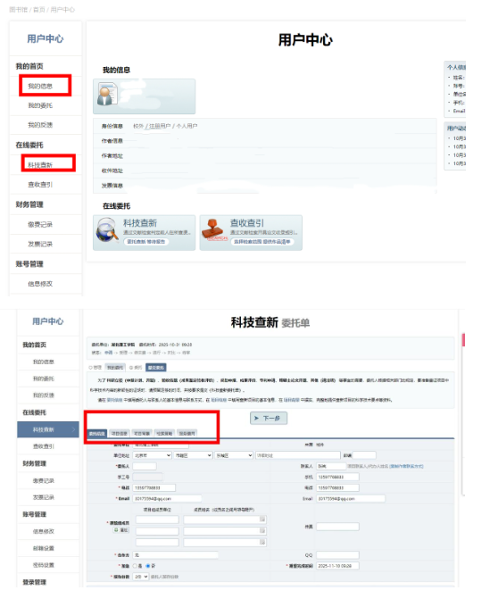 5.在系统中完善个人信息后,点击“科技查新”,根据系统提示完成“委托信息”、“项目信息”、“项目背景”等流程。