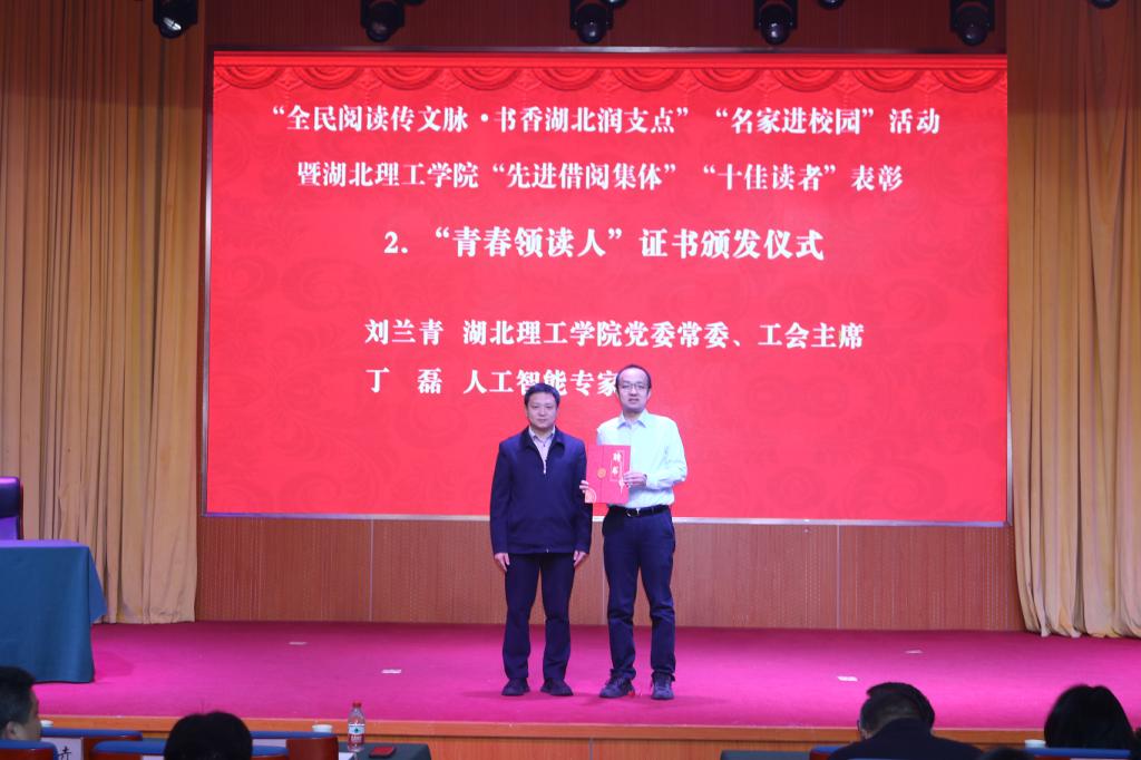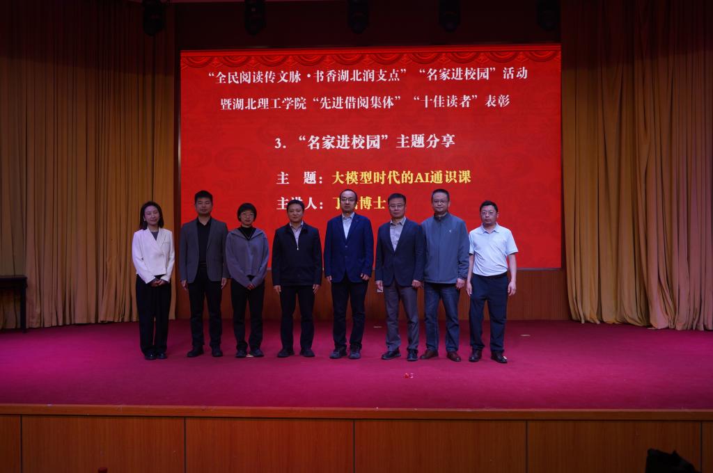 4月25日上午,学校在豁度楼208报告厅举办“全民阅读传文脉·书香湖北润支点”“名家进校园”活动暨2025年度“先进借阅集体”“十佳读者”“优秀读者”表扬大会。校党委常委、工会主席刘兰青,黄石市委宣传部新闻出版科负责人曹小卉,黄石市新华书店党支部书记、经理胡涛,黄石市新华书店纪检委员、副经理王莎,人工智能领域专家丁磊博士及学校各相关部门、学院领导、师生代表出席了活动。